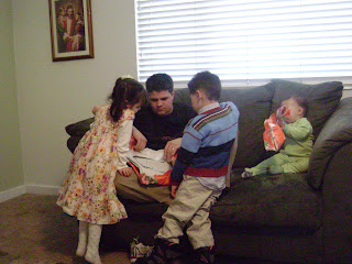 Okay so this post is a little late but, For Bret's Birthday this year we had a little thing at our house with some friends. The kids and I made a double layer German Chocolate cake. We also got him High School Musical 3 (kids pick), a new battery for his Mustang, and some new Church pants. We enjoyed celebrating his Birthday with him and we are so grateful for the husband and Father he is to us. We are very blessed because of him.